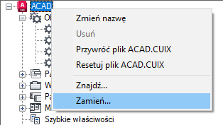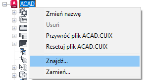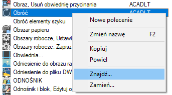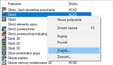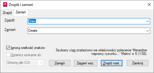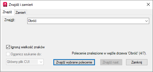 Zostanie wyświetlony komunikat, który określa lokalizację polecenia, jego dokładne położenie w panelu Dostosowywanie w lub panelu Właściwości oraz liczbę jego wystąpień.