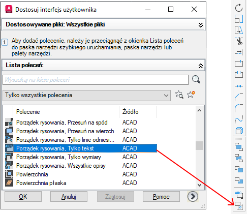 - Na panelu Lista poleceń przeciągnij polecenie, które chcesz dodać, do paska narzędzi na panelu Dostosowywane pliki: <nazwa pliku>.