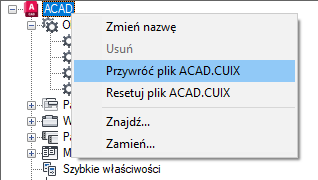Uwaga: Resetować można tylko pliki CUIx znajdujące się w folderze UserDataCache w lokalizacji instalacji programu.