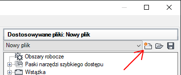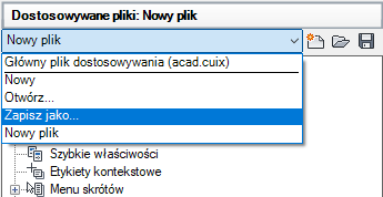 Wszystkie nowe polecenia są bezpośrednio dodawane do roboczego pliku CUIx. Jeśli plik CUIx, który zostanie użyty, nie został wczytany, na liście rozwijanej Pliki dostosowywania kliknij przycisk Otwórz. Następnie wybierz plik CUIx, który chcesz używać.