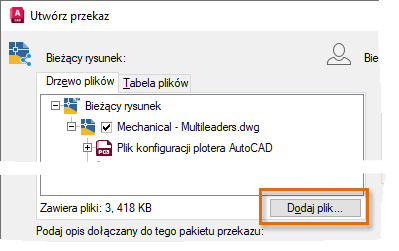 W oknie dialogowym nawigacji Dodaj plik do przekazu przejdź do folderu C:\Program Files\Autodesk\AutoCAD <wersja>\Sample\Mechanical Sample.