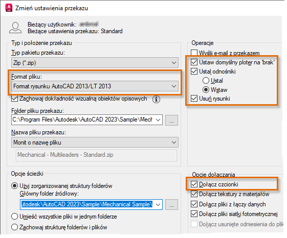 W obszarze Typ i położenie przekazu kliknij listę rozwijaną Format pliku i wybierz opcję Format rysunku AutoCAD 2013/LT 2013.