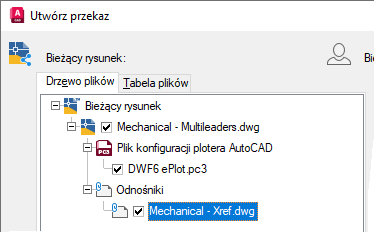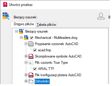 Zwróć uwagę na zmiany w drzewie plików. Pliki powiązane z czcionkami użytymi w rysunku należą teraz do pakietu przekazu.