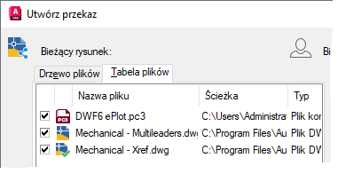 Funkcja eTransmit przeszukuje bieżący rysunek pod kątem plików, do których rysunek się odwołuje, a znalezione pliki wyświetlane są w oknie dialogowym Utwórz przekaz.