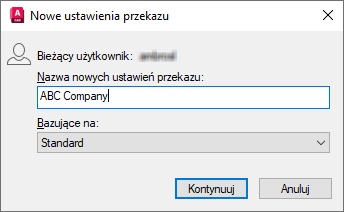 W polu tekstowym Nazwa nowych ustawień w oknie dialogowym Nowe ustawienia przekazu zastąp domyślną nazwę, wpisując Firma ABC. Kliknij przycisk Kontynuuj.