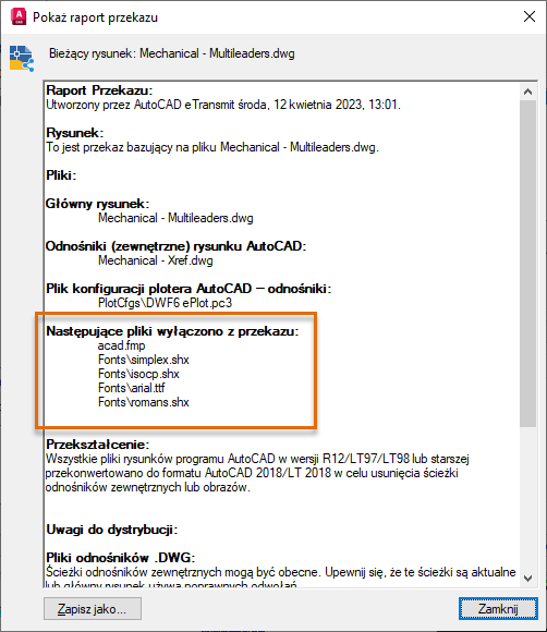 Funkcja eTransmit działa w ten sposób, że bieżący rysunek oraz następujące typy plików pomocniczych, do których rysunek się odwołuje (pliki odnośników), zostaną automatycznie dodane do pakietu przekazu: