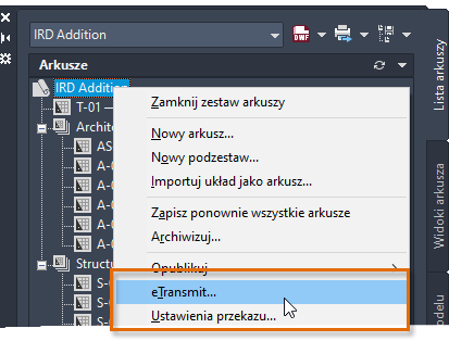Uwaga: Menedżer zestawów arkuszy zawiera opcję archiwizacji, która przypomina funkcję eTransmit, ale oferuje mniej opcji związanych z czyszczeniem rysunków, ponieważ jej celem jest tworzenie kopii zapasowej wszystkich plików.