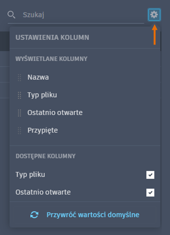 - Nagłówki kolumn w widoku listy można dostosować, klikając ustawienia. Stałe kolumny to Nazwa i Przypięte.