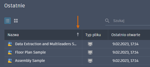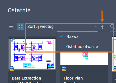 Miniatury na liście ostatnio używanych rysunków są mniejsze, aby umożliwić wyświetlanie większej liczby rysunków. Można teraz sortować i przeszukiwać ostatnie rysunki zarówno w widoku siatki, jak i widoku listy.