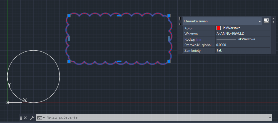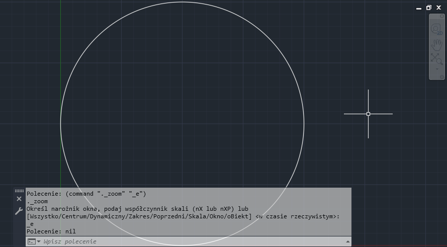 Rysunek jest powiększany do zakresu okręgu, jeśli jest to jedyny obiekt na rysunku, w przeciwnym razie powiększany jest do zakresu wszystkich obiektów na rysunku.