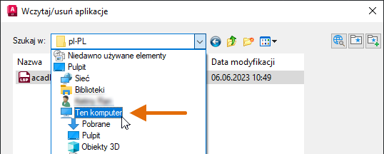 Po utworzeniu pliku, zamiast używać okna dialogowego Wczytaj/usuń aplikację wyświetlanego z poleceniem WCZYTAJAPL, plik LSP można wczytać przy użyciu Eksploratora plików.