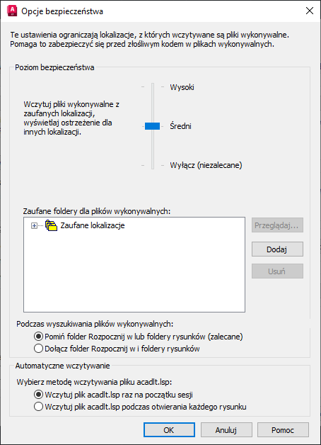 | SECURELOAD | Kontroluje, czy pliki wykonywalne są wczytywane z ograniczeniem tylko do zaufanych folderów. | 1; może być zablokowane przez administratora CAD | Rejestr |