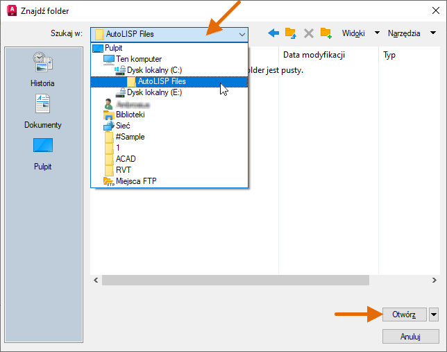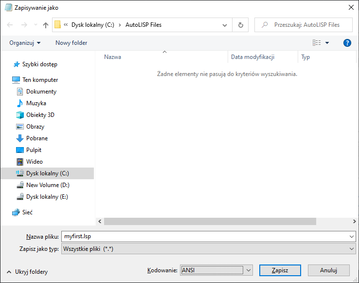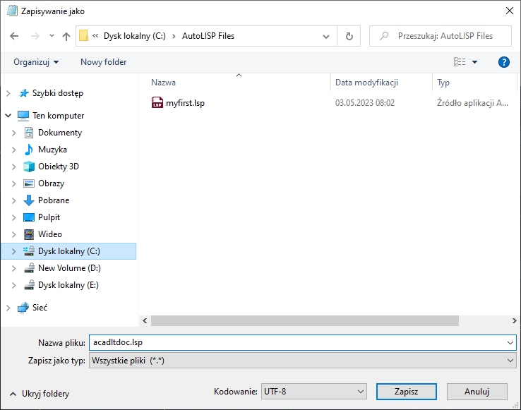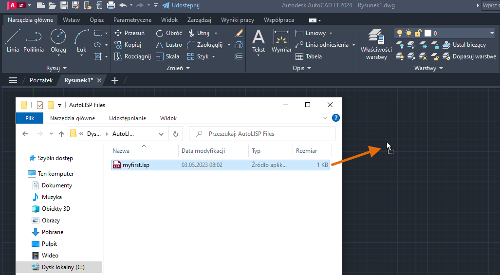 Jeśli plik myfirst.lsp został utworzony w poprzedniej sekcji, można go wybrać.
