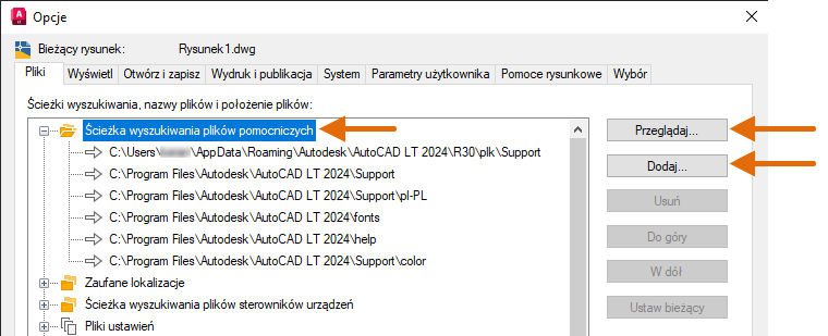 AutoCAD LT wyszukuje i automatycznie wczytuje następujące cztery pliki, jeśli znajdują się w ścieżkach pomocniczych:
