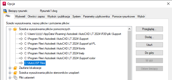 Wyświetlone foldery to te, w których program AutoCAD LT szuka plików AutoLISP wśród innych typów plików niestandardowych używanych do przechowywania wzorów kreskowania, rodzajów linii, aliasów poleceń oraz definiowania nowych elementów interfejsu użytkownika.