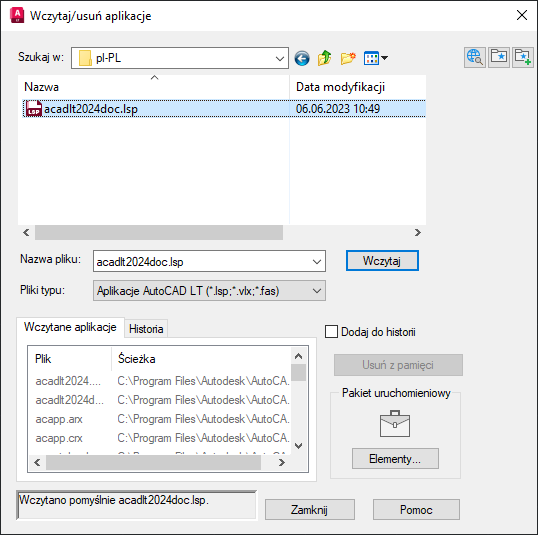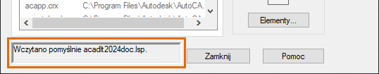 W oknie komunikatu, w lewym dolnym rogu okna dialogowego oraz w oknie wiersza polecenia zostanie wyświetlony komunikat „Wczytano pomyślnie acadlt2024doc.lsp”.