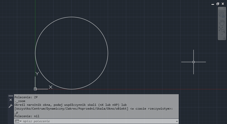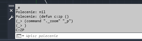 Spróbujmy użyć funkcji defun i zdefiniować niestandardowe polecenie o nazwie ZP, które spowoduje przywrócenie powiększenia do poprzedniego widoku rysunku: