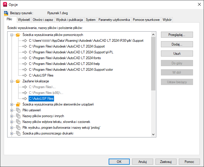Po zidentyfikowaniu folderu do przechowywania plików AutoLISP należy poinformować program AutoCAD LT o lokalizacji folderu przy użyciu ustawień Ścieżka wyszukiwania plików pomocniczych oraz Zaufane lokalizacje na karcie Pliki w oknie dialogowym Opcje. Program AutoCAD LT musi znać położenie plików LSP z następujących powodów: