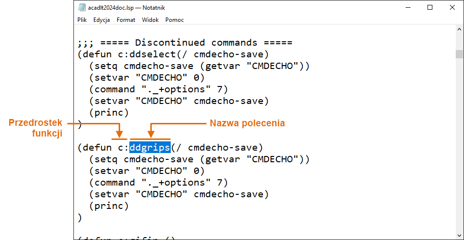 Poniższy rysunek przedstawia część pliku acadlt2024doc.lsp otwartego w Notatniku. Polecenia zdefiniowane w języku AutoLISP, które można wpisywać w wierszu polecenia, poprzedza przedrostek c:. Tekst bezpośrednio po c: jest nazwą polecenia.