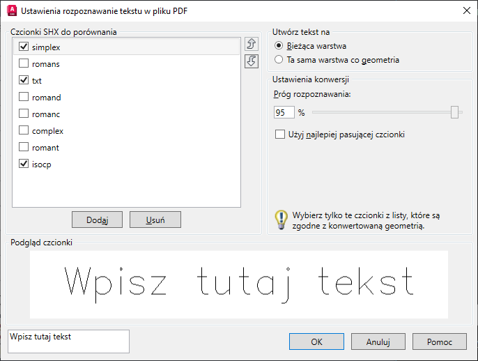 Służy do określania opcji konwersji geometrii SHX importowanej z plików PDF w indywidualne obiekty tekstu wielowierszowego.