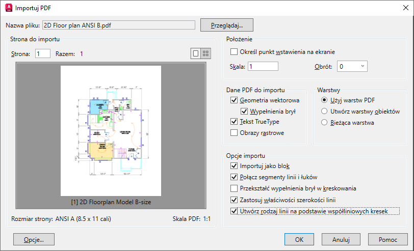 Tworzy warstwy programu AutoCAD dla każdego z następujących ogólnych typów obiektów importowanych z pliku PDF: PDF_Geometria, PDF_Wypełnienia jednorodne, PDF_Obrazy i PDF_Tekst.