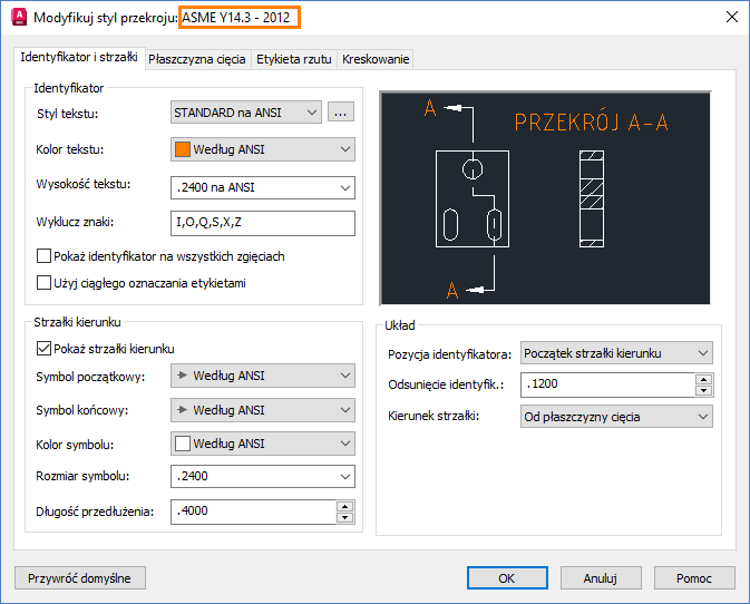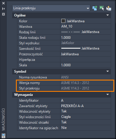 Symbol linii przekroju w programie AutoCAD Mechanical został zaktualizowany, aby obsługiwać wersję normy AWS Y14.3 - 2012. Aby zapewnić obsługę normy AWS Y14.3 - 2012, wszystkie aspekty symbolu linii przekroju zostaną zmienione, aby odpowiadały normie AWS Y14.3 - 2012.