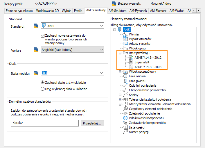 W zestawie narzędzi AutoCAD Mechanical 2024 nowa wersja normy ANSI jest domyślną normą w nowym rysunku. Po otwarciu starszego rysunku norma domyślna zostanie zmieniona na starą wersję normy. Wersję normy można zmienić w oknie dialogowym Opcje.