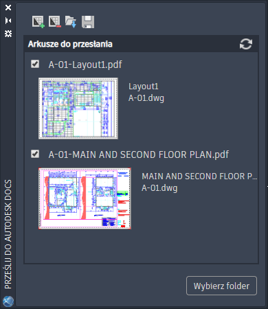 Współpraca na miejscu budowy dzięki przesyłaniu układów rysunków jako plików PDF do chmury Autodesk Docs. Wybieranie układów z wielu rysunków i przesyłanie ich jako plików PDF do wybranego folderu projektu w chmurze Autodesk Docs.