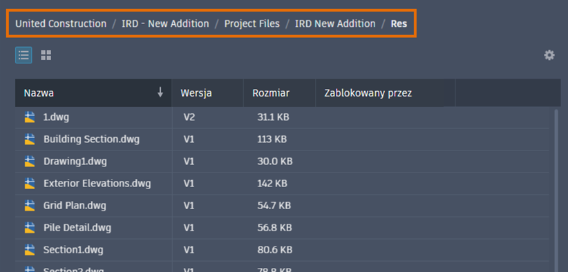 - Powyżej listy rysunków projektu są wyświetlane ścieżki nawigacji w bieżącym projekcie.