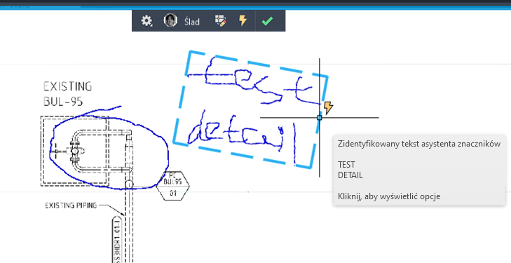 Asystent znaczników automatycznie identyfikuje znaczniki jako tekst, linie odniesienia i chmurki wersji. Kliknij zidentyfikowany znacznik, a następnie wstaw go jako tekst wielowierszowy, wielolinię odniesienia lub chmurkę wersji. Tekst można edytować przed wstawieniem lub skopiować do schowka.