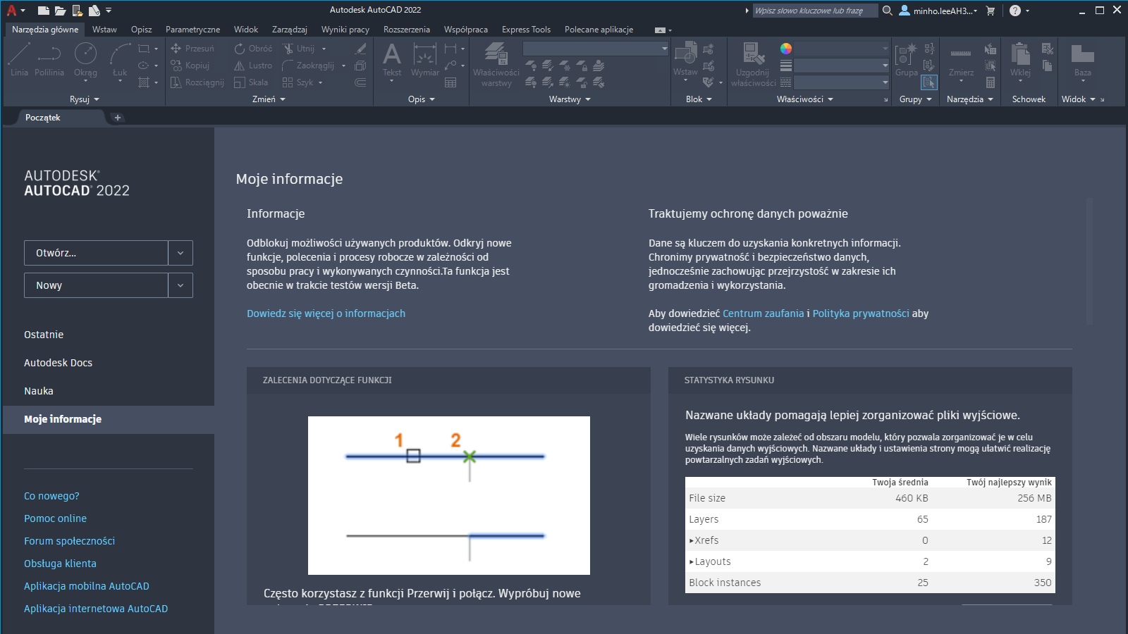 Informacje o użytkowaniu produktu wyświetlane są na karcie Początek. Informacje przekazywane przez funkcję Moje informacje oparte są na sposobie korzystania z programu AutoCAD. Przekazywane treści mają charakter informacyjny i użyteczny. Zobacz sugestie dotyczące poleceń i funkcji, które można wypróbować razem z innymi informacjami dotyczącymi wydajności.