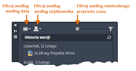 Historię wersji rysunków przechowywanych w chmurze można przeglądać na nowej palecie Historia rysunku, dzięki czemu można je porównać z bieżącą wersją rysunku.