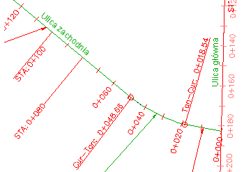 Zauważmy, że w etykietach znajduje się teraz tekst tej samej wielkości. Tekst etykiety STA:0+080 ma taką samą wielkość, jak tekst etykiety STA: 0+100, ponieważ wysokość tekstu w stylu pochodnym została nadpisana przez wysokość w stylu macierzystym. Wyrównanie linii wciąż jest inne, ponieważ punkt dołączenia tekstu w stylu pochodnym nie został nadpisany.