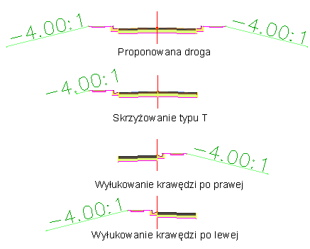 Rysunek zawiera powierzchnię terenu istniejącego, a także linie trasowania i polilinie osi definiujące proponowaną 50-stopową granicę pasa drogowego.