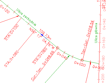 Styl etykiety zmienia się tylko dla etykiety pikiety 0+060. Pozostałe etykiety pikiety głównej na ulicy zachodniej zachowają swój styl.