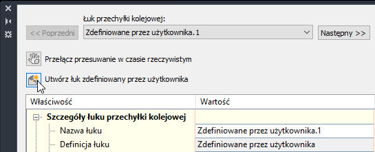 Poprzednio przechyłkę kolejową można było dodawać tylko do elementów łuku. Dzięki tej nowej możliwości tworzenia łuków zdefiniowanych przez użytkownika po wyświetleniu monitu o wybranie elementów na rysunku można wybrać krzywe przejściowe lub styczne.