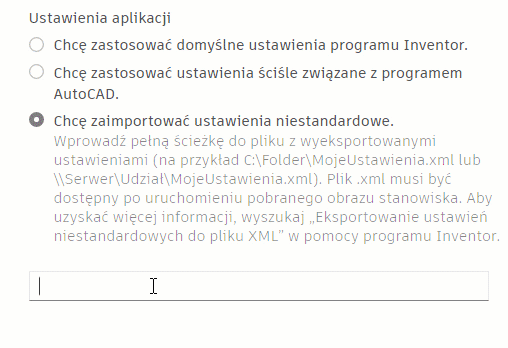 Opcja 1: Chcę zastosować domyślne ustawienia programu Inventor.