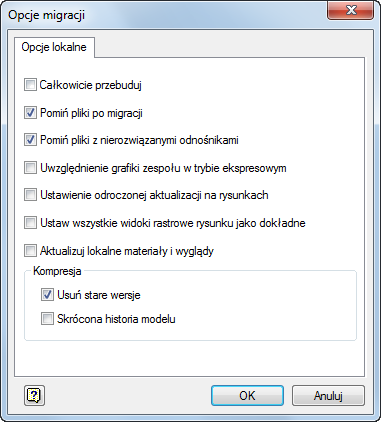 - Skrócona historia modelu: nie wybieraj tej opcji w przypadku migracji plików do nowej wersji, ponieważ powoduje ona usunięcie historii ponownego przebiegu użytej do szybkiej edycji elementów. Opcji tej należy używać tylko podczas pracy z bardzo dużymi zespołami w przypadku zauważalnego ograniczenia wydajności.