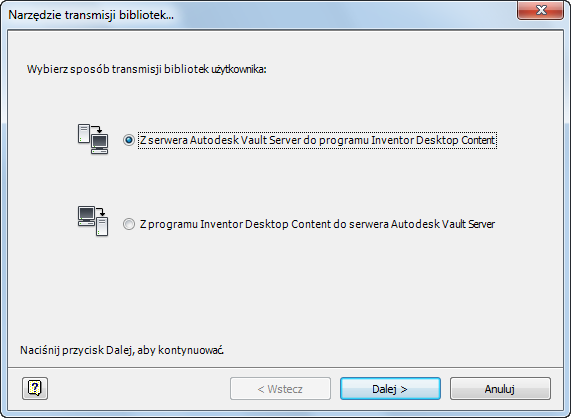 - Kliknij przycisk „Narzędzie transmisji bibliotek...”, aby wyświetlić okno dialogowe Narzędzie transmisji bibliotek. Patrz rysunek 2. Wybierz opcję Z Autodesk Vault Server do Inventor Desktop Content.