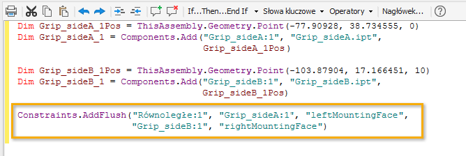Wiele nowych funkcji zespołu iLogic ułatwia pisanie kodu reguły w celu dodawania, modyfikowania i usuwania komponentów i wiązań. Oto kilka przykładów: