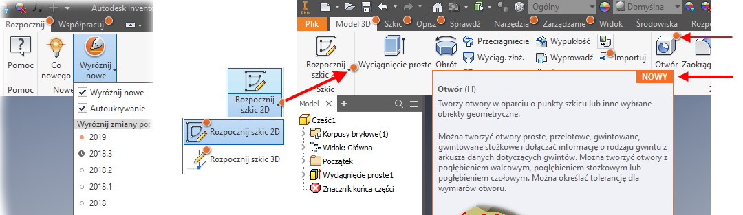 Podczas instalowania programu Inventor można wyrazić zgodę na gromadzenie danych. Na podstawie wprowadzonych przez użytkownika danych dotyczących użytkowania programu Inventor polecenie Widok przekroju w połowie jest najczęściej używane w przypadku modeli części i zespołów. W związku z tym w tej aktualizacji polecenie Widok przekroju domyślnie jest ustawiane jako Widok przekroju w połowie w przypadku pierwszego użycia w sesji programu Inventor. Dziękujemy za pomoc w doborze właściwego ustawienia tego narzędzia. Dostęp do polecenia Widok przekroju można uzyskać z kart Widok i Opisz w dokumentach części i zespołów.