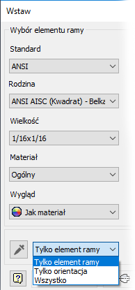 Obecnie można skopiować informacje z istniejących elementów ramy w przypadku użycia poleceń Wstaw i Zamień. Wybierz pipetę w oknie dialogowym, aby włączyć kopiowanie właściwości, a następnie wybierz element. Istnieje możliwość wyboru skopiowania informacji dotyczących tylko elementu ramy, tylko orientacji lub obu.