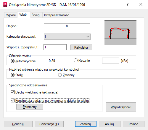Kliknięcie przycisku Współczynniki powoduje otwarcie okna dialogowego, w którym określone mogą zostać współczynniki dla obciążenia wiatrem.