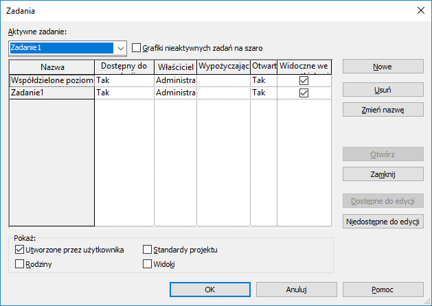 Na obrazie przedstawiono okno dialogowe Zadania z dwoma domyślnymi zadaniami utworzonymi przez użytkownika: Współdzielone poziomy i siatki oraz Zadanie1.