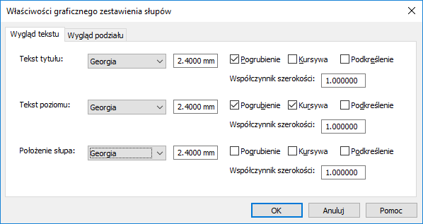 Użytkownik może dostosować formatowanie tekstu w graficznym zestawieniu słupów. W obszarze Tekst na palecie Właściwości kliknij przycisk edycji Wygląd tekstu.