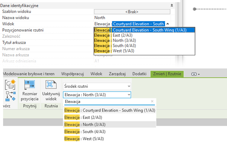 - Na karcie Zmień | Rzutnie -> panel Rzutnia -> Pozycjonowanie i widok wybierz widok z listy rozwijanej.