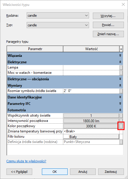 - W oknie dialogowym Parametry i kategoria rodziny w obszarze Parametry rodziny wybierz opcję Źródło światła.