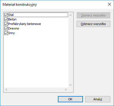 Wybierz każdy materiał, który ma być wyświetlany i kliknij przycisk OK. Domyślnie wybrane są wszystkie materiały.