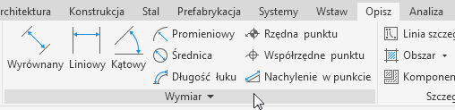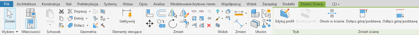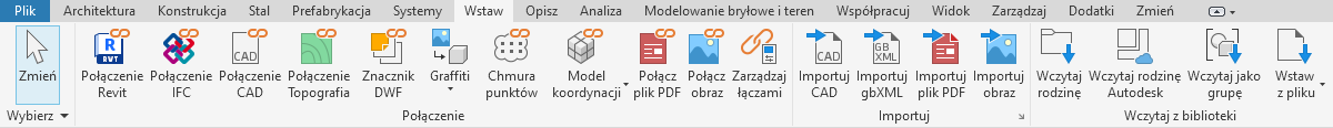 Wstążka jest wyświetlana podczas tworzenia lub otwierania pliku. Zawiera ona wszystkie narzędzia potrzebne do utworzenia projektu lub rodziny.