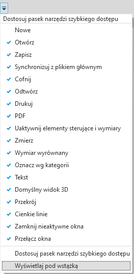 Pasek narzędzi szybkiego dostępu zawiera zestaw domyślnych narzędzi. Użytkownik może go jednak dostosować, tak aby były na nim wyświetlane narzędzia najczęściej używane.